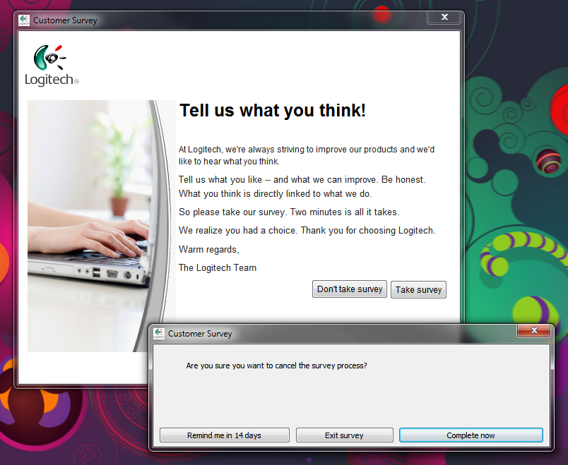 And after I reboot, I get asked about a survey. I say no, because I don’t want to fill it out. Then you bug me again? How is this good interface design? I’ve got two dead mice from you (a G5, and now an Anywhere MX which drifts all over the place) and you’re bugging me about a survey?
