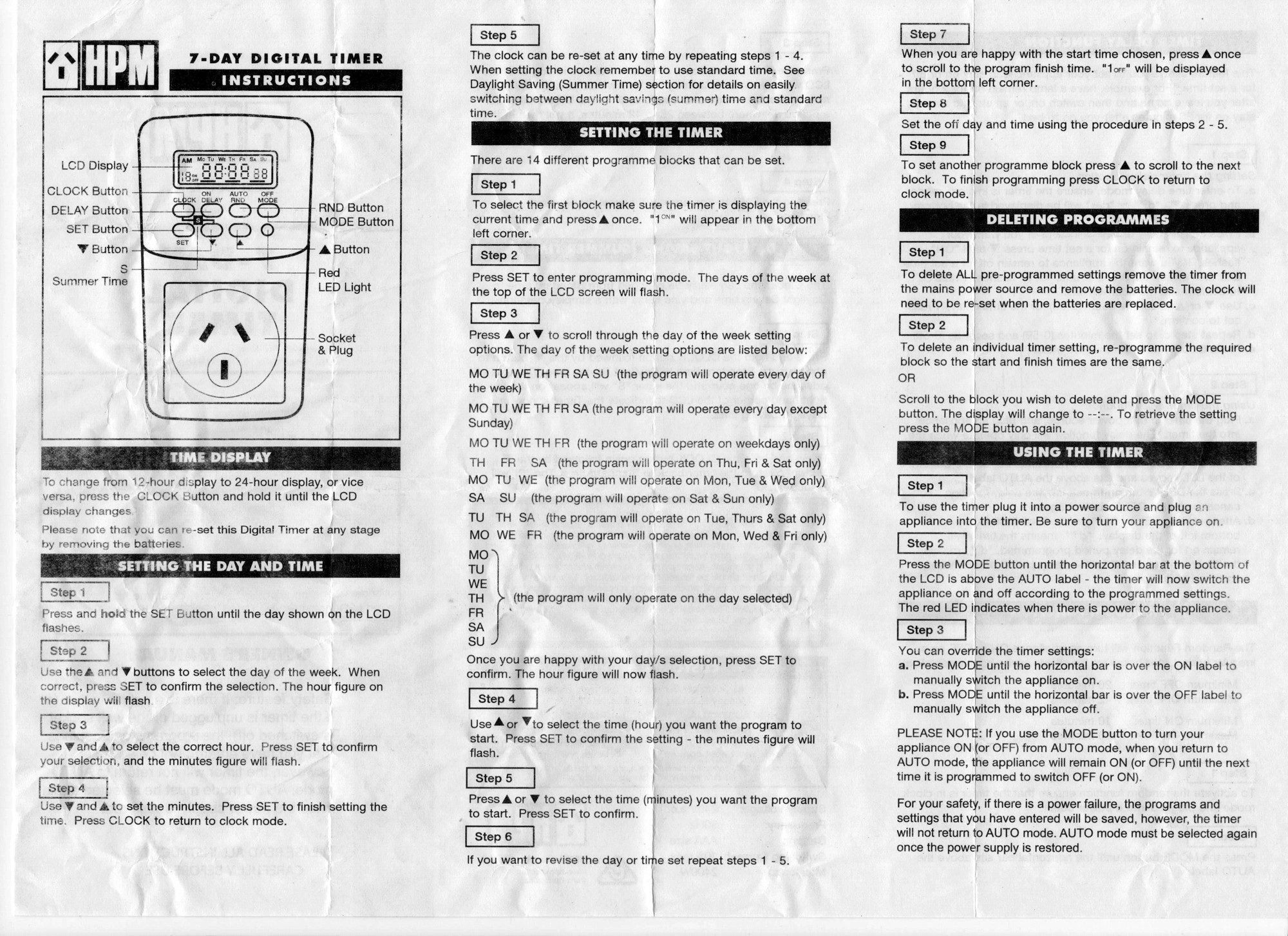 HPM has taken down the manual for these handy battery-backed timer devices, so I’ve recreated the documentation I could find here. We use them at work for a variety of power control situations, including turning off banks of 46″ LCD TV’s overnight, so they can handle a fair amount of power.