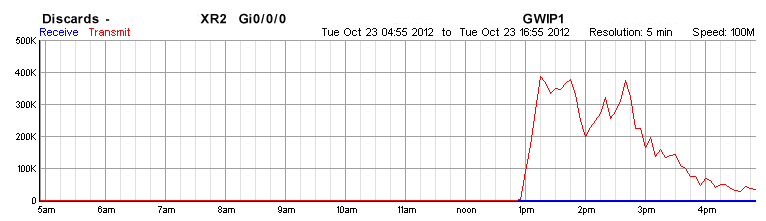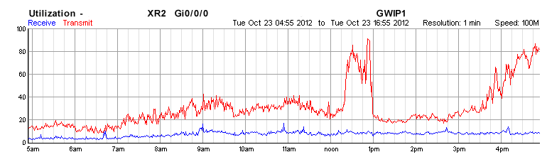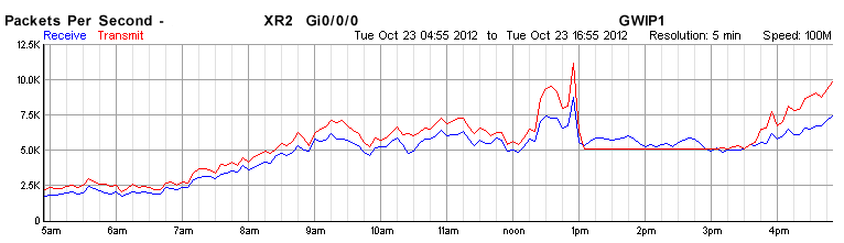 - Approximately 1305 outbound usable bandwidth from our active GWIP link dropped to an average of ~20Mbit/second. The maximum outbound packet rate sat on approximately 5000 packets/second. Inbound data was not affected.