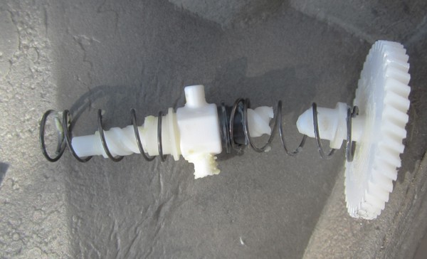 When you’re reassembling the actuator, it takes a little bit of trickery. I found if you put the first spring on, then the little black spacer, then the moving block, you can use the block to hold the spring in place. You’ll have to hold the other end of the spring away from the large cog so that it’ll fit into the main housing of the actuator.