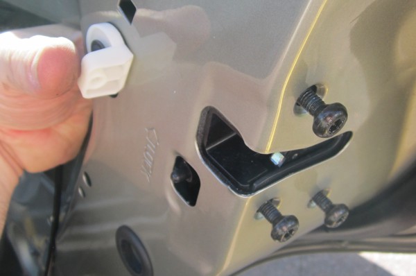 Once you’ve done that, you have to disconnect the lever that connects the outside door handle with the locking system. There’s a little black locking lever that you push down on, and it releases from the rod allowing it to be removed.