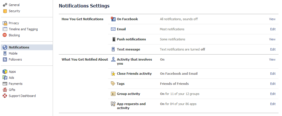 - If that doesn’t work, click on the little gear/settings icon in the top right, then account settings. Once that loads, click on “Notifications” on the left. You should see a screen like this: