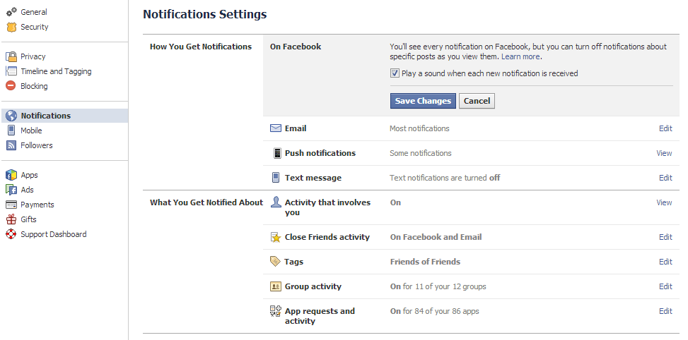 - Un-tick the box that says “Play a sound when each new notification is received” and click “Save Changes”. You should see a screen similar to this: