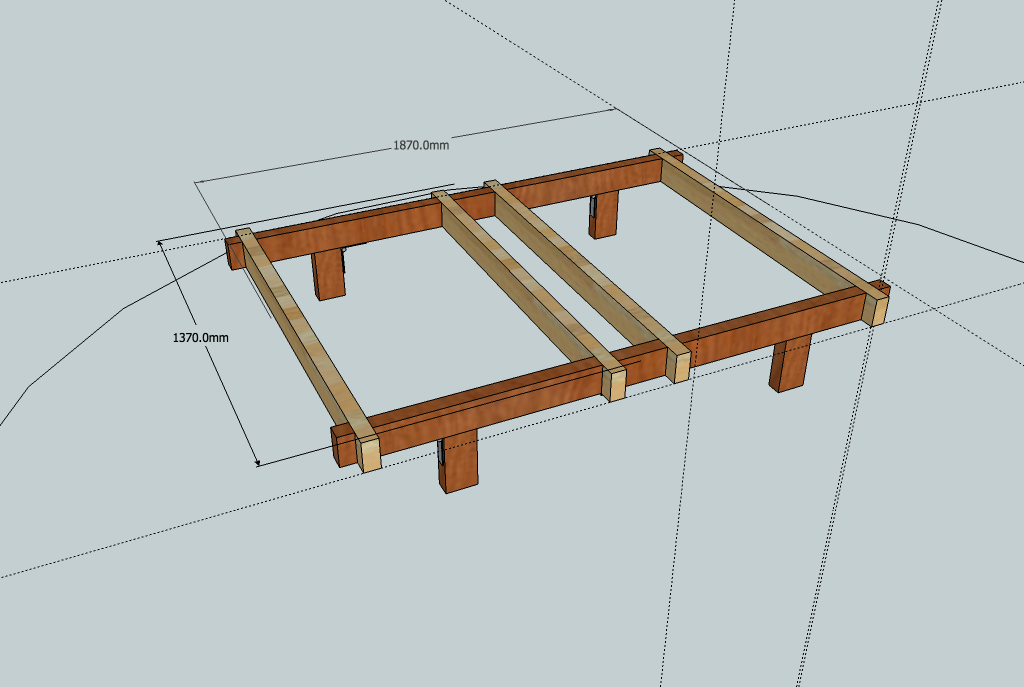 So, ugly horrible metal bedframes suck. I needed to come up with a new design for a double-mattress supporting bed frame and here’s my first idea.