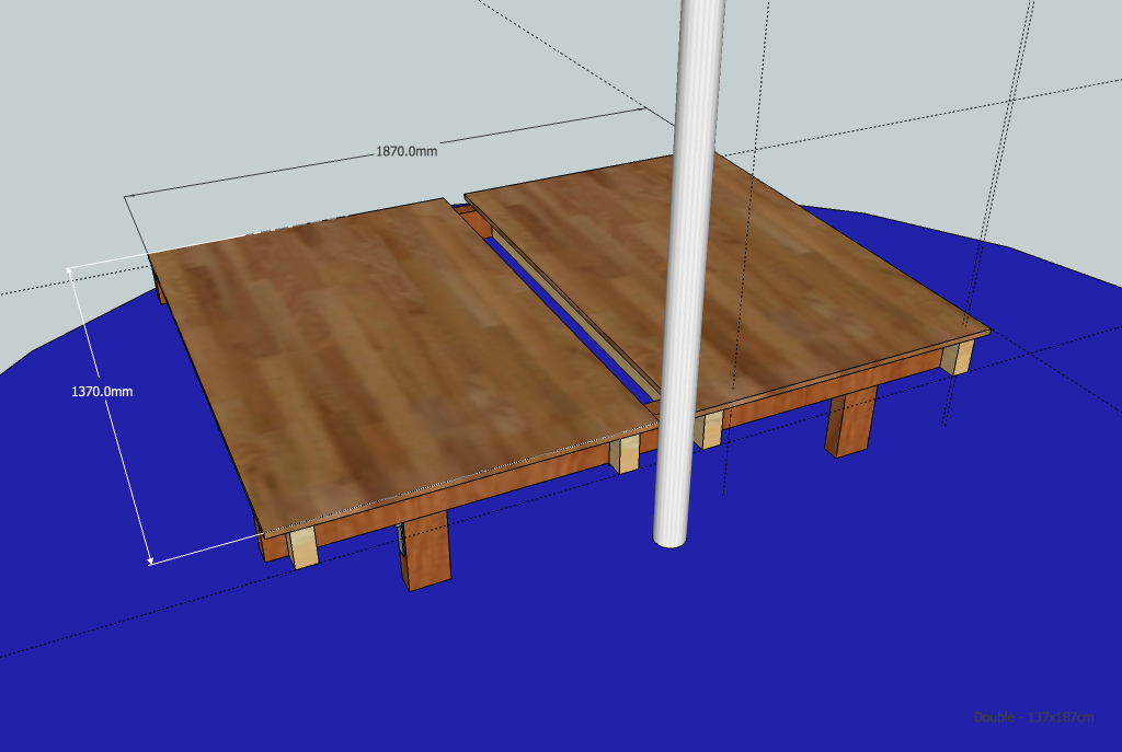 So, ugly horrible metal bedframes suck. I needed to come up with a new design for a double-mattress supporting bed frame and here’s my first idea.