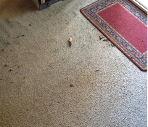 Our captor refuses to accept that the correct place for my collection of tiny pieces of wood is on the short, light coloured grass past the mesh gate. I don’t know why he keeps calling it “carpet” when it’s plainly grass. More proof that he is truly foolish.