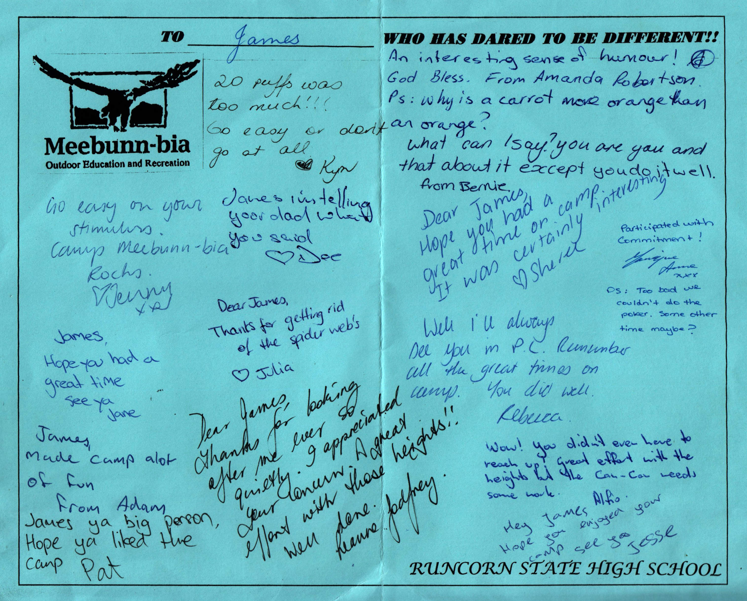 My mum and dad were cleaning out some stuff and in the boxes of my junk I found this… a weird shared valentine’s day card from a school camp I went to.