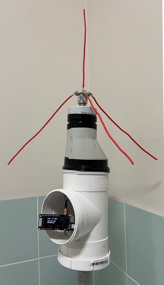 I wanted a waterproof version, so after mucking around at Bunnings one night figuring out which parts would fit together, this strange thing came to life. The top “cap” is 50mm nominal, so the N-type connector poking through the top has plenty of height for the angled parts to do their thing.