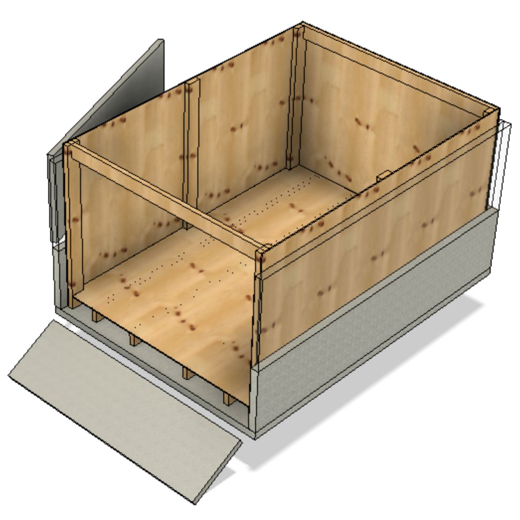 I started playing with the idea of building a collapsible camper-module to go inside my 7’x5’ trailer. I’ve been pondering this for a while, because it’d be nice to go caravan-ish camping without having to buy/build/own a dedicated caravan. The general idea is to have a floor, three walls, a back door and a roof, all of which can be separated and stored in the smallest possible footprint. This turns into a box which keeps the elements away from my stuff while travelling and gives me a place to sleep that doesn’t require tent-like setup, mainly because I’m lazy and big.