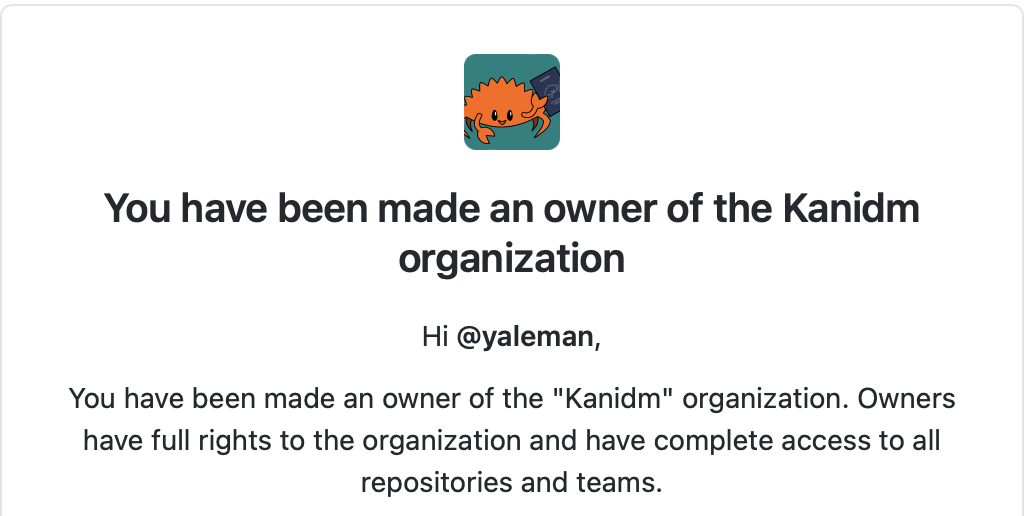 Whoa, I was made a member/owner of the kanidm organisation today. That’s a fair bit of responsibility, and it’s great to have that trust.